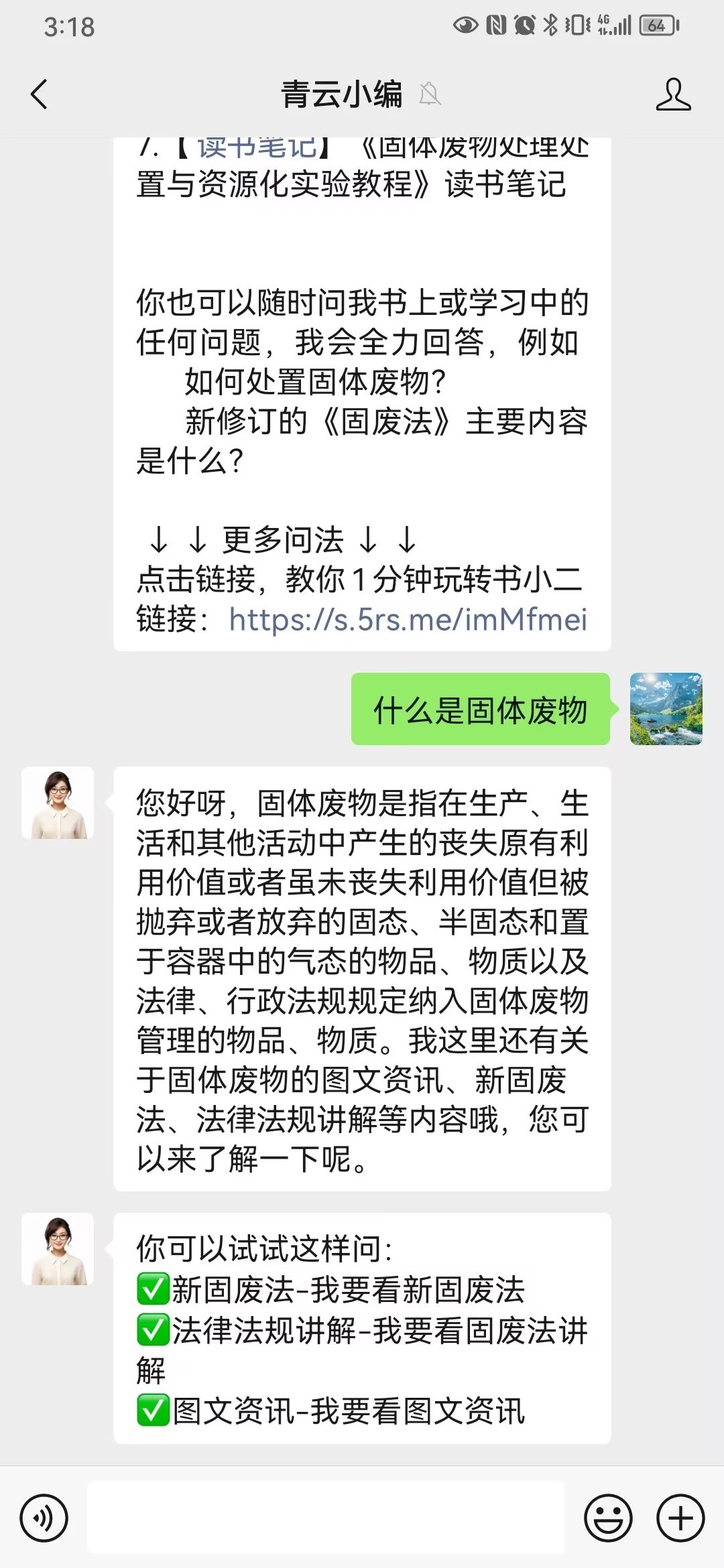 2023年開始,中國環境出版集團開始探索使用“AI數字人”應用。在《固體廢物處理與污染控制新形態實驗教程》(高校環境類新形態系列教材)中,“AI青云小編”便可實現人機交互問答,方便讀者獲取教材所配套的操作視頻、在線微課、相關法律解讀等,滿足個性化的學習、成長需求。